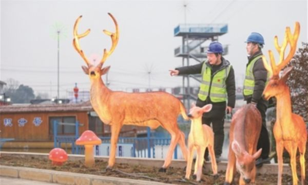 图为园区工作人员在对元宵灯会的用电线路进行安全隐患排查和彩灯调试。